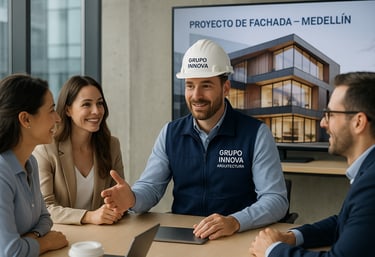En Grupo Innova Arquitectura transformamos las ideas en realidades sólidas, funcionales y visualmente impactantes. Somos una empresa con sede en Medellín que trabaja a nivel nacional, especializada en el diseño, fabricación e instalación de fachadas arquitectónicas en Aluminio compuesto, vidrio y panel metalico, cubiertas y estructuras metálicas de alta calidad.
